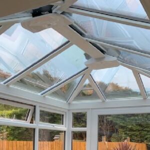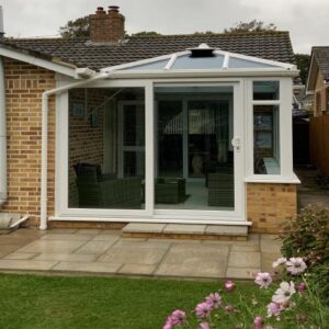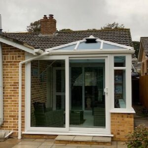 This is a classic double-hipped Edwardian conservatory using modern glazing properties to achieve all-year usability, whether in the depths of winter or heights of summer. This design onto the chalet bungalow was achieved using a fabricated box guttering system.