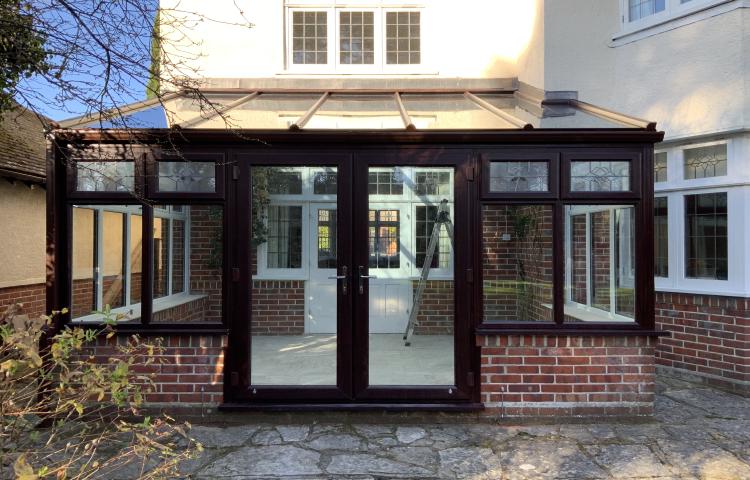 Rosewood coloured Windows & Door frames. A classic example of a popular lean-to Conservatory design.