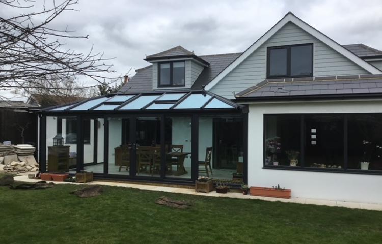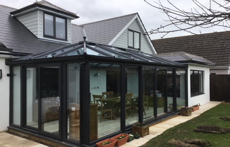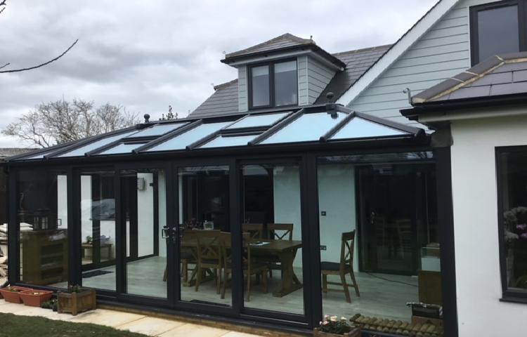 Grey anthracite conservatory featuring modern solar controlled glazing.