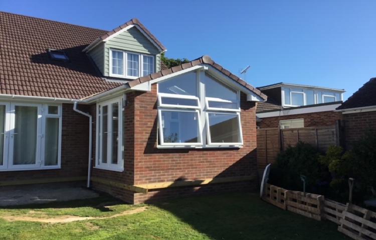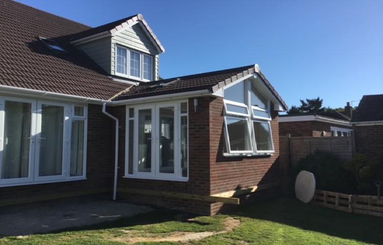 We cut into the existing house roof to construct this gable end extension. It features an internally vaulted roof with a glazed gable front elevation and PVC french doors with adjoining side panels on the side elevation to create a practical usable extension of the client’s existing lounge / dining area.
