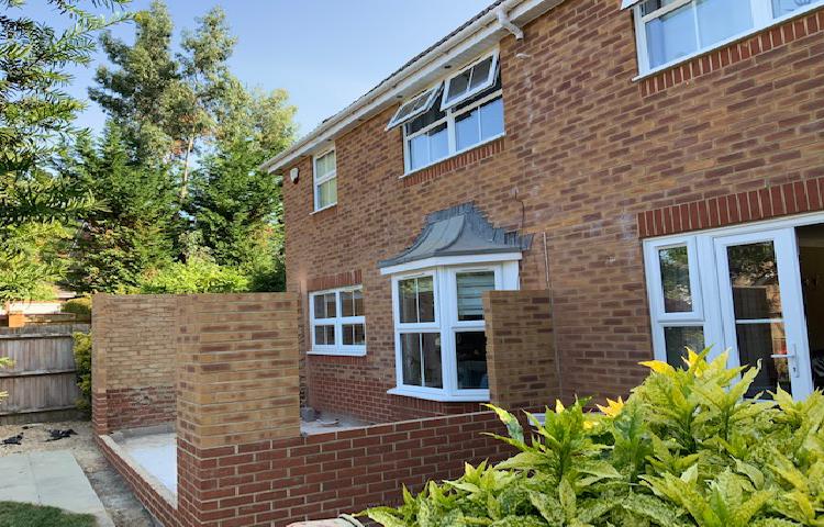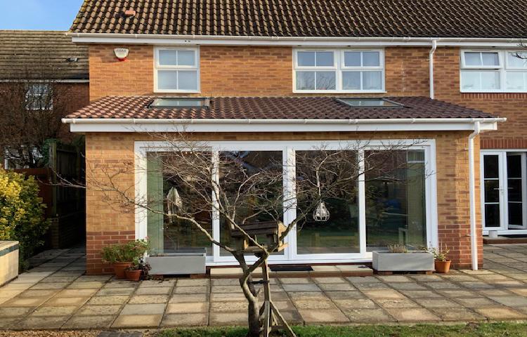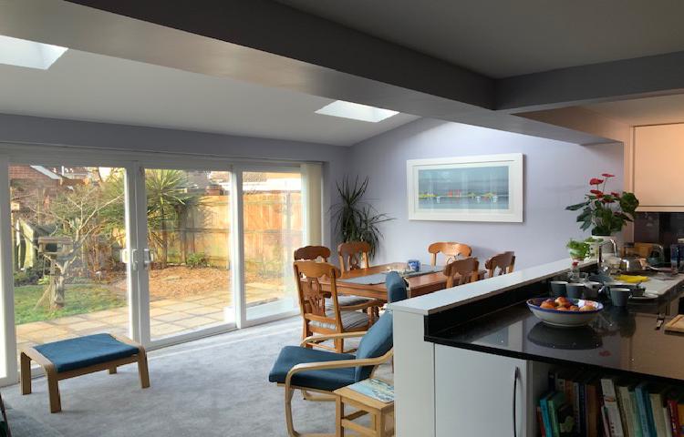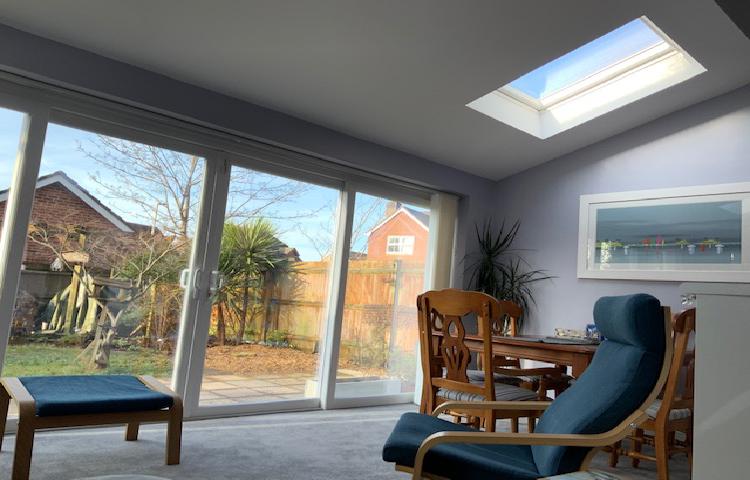 Lean-to traditional extension featuring matching house tiles to the main home and two large Velux roof opening windows. This installation required the removal of a kitchen bay window and knocking through to the existing kitchen, creating an open plan living space from the kitchen into the new dining/lounge area.