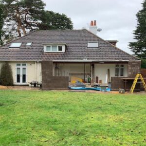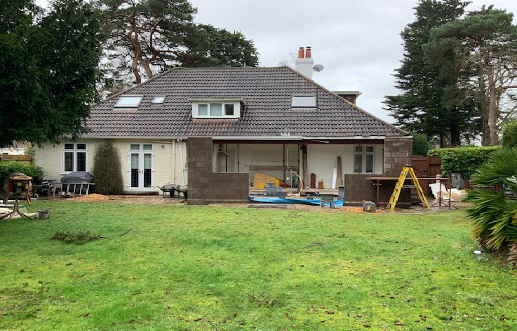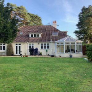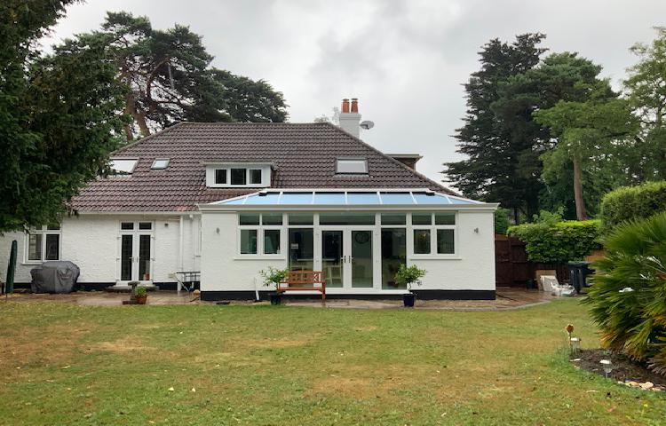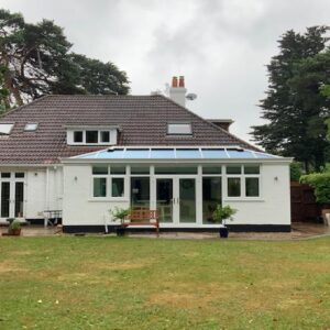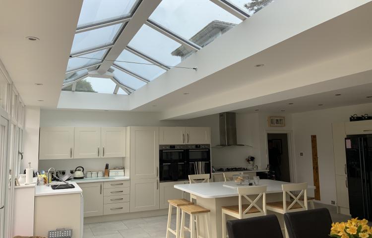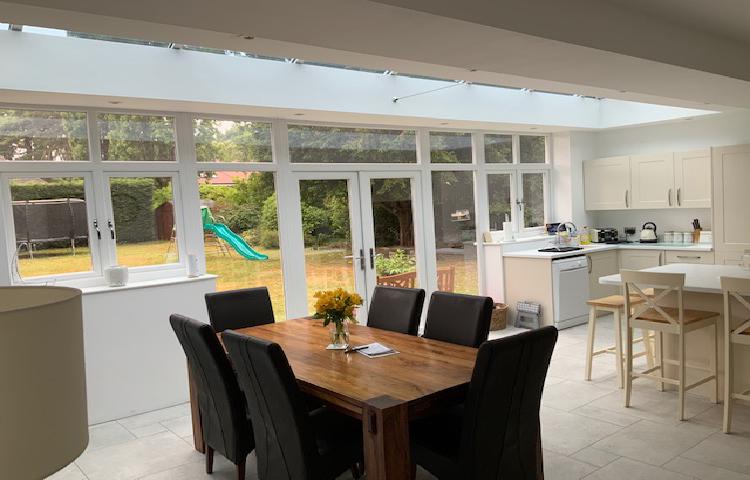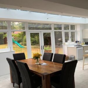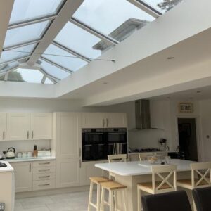 This client inherited an existing dated extension built on the back of the kitchen. Our team designed and installed the replacement kitchen lounge orangery, which involved knocking-through and removing a large section of the house wall and installing a new RSJ lintel. The project includes a LIVin Room orangery roof system with an internal plastered pelmet and an external aluminium cornice gutter for the modern orangery look.
