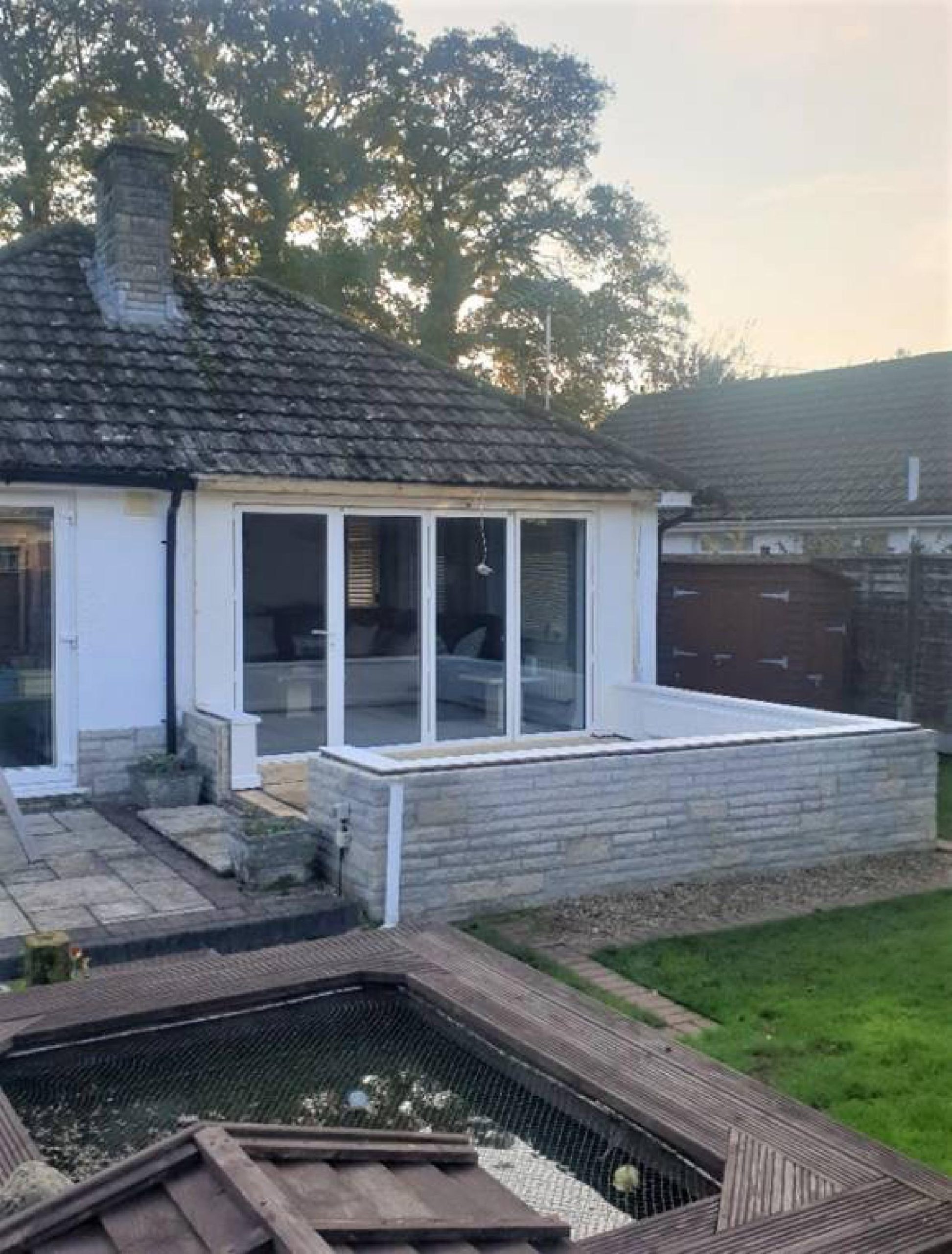 We carefully removed this clients existing dated Conservatory and replaced it with a modern tiled solid roof system and with new pvc side frames, glazing and french doors. The roof has a couple of contemporary glazing strips adding real class as well as allowing lots of the natural light to flood in to the new extension space.