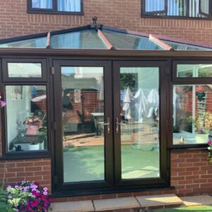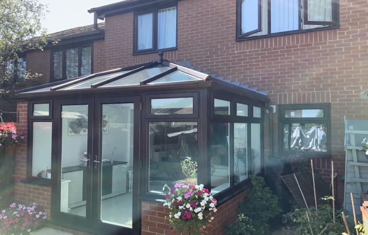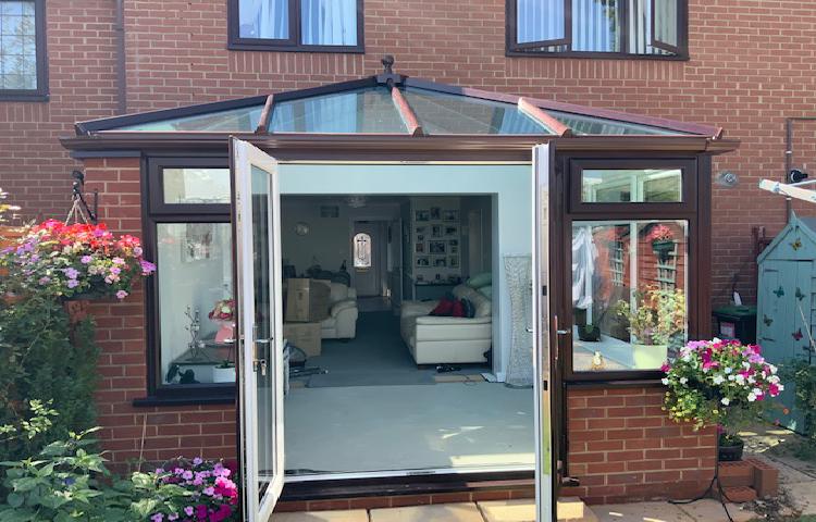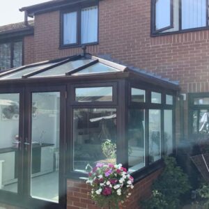 New single hipped Edwardian-style conservatory designed to suit the existing property with a Rosewood external colour and white internally. Features an 4000cm by 3000cm projection with an open plan living space between the house and the conservatory. Following the building work for the foundations and dwarf walls, the first fix electrics, installation of the conservatory frames, roof and doors were completed all with the latest products available.
