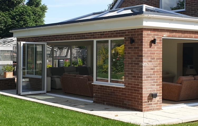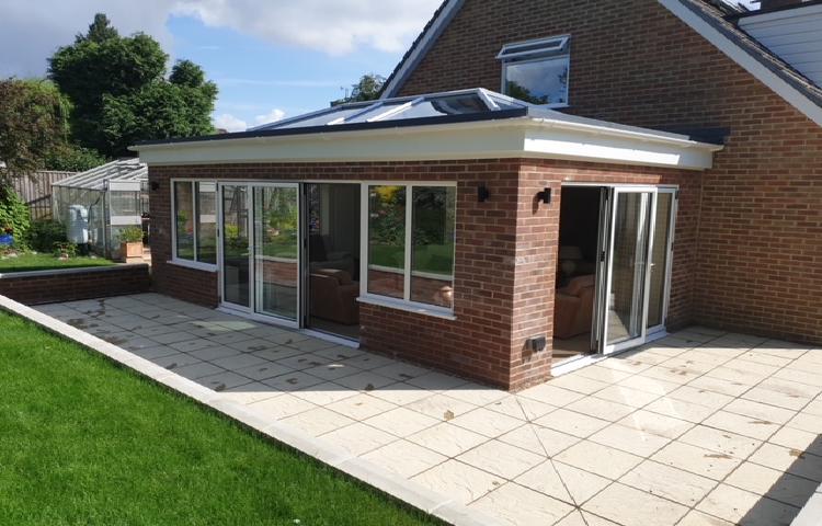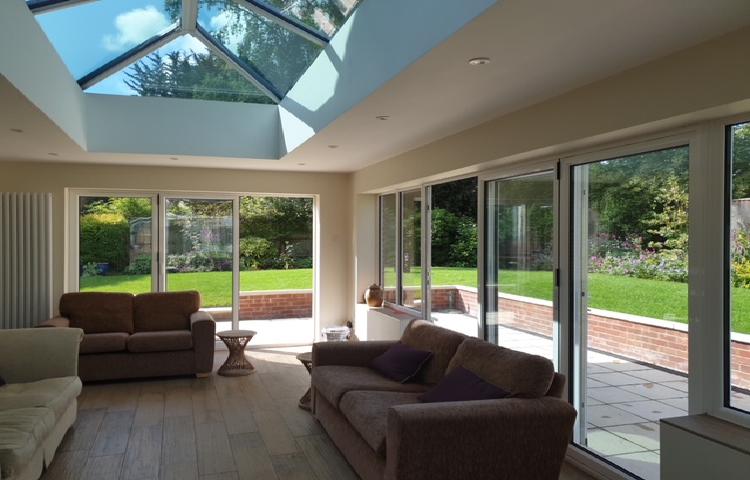 Modern aluminium roof lantern and bi-folding doors work together with an open plan living space to create a light and spacious family room.