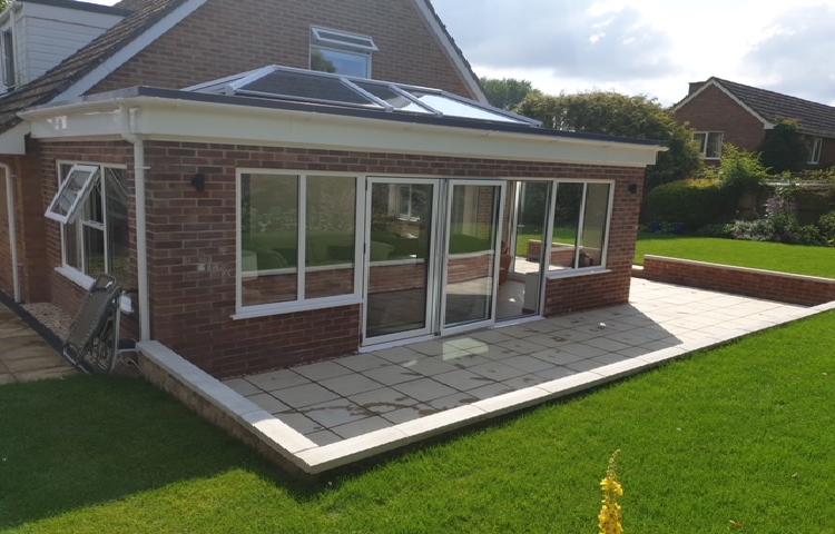 This stunning traditional fascia orangery and patio installation features a large sleek aluminium roof lantern and aluminium bi-folding doors on 2 elevations. Open plan with the main dwelling this created a vast practical living space for the client to enjoy.