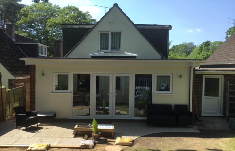 A traditional fascia orangery constructed with internal matching ceiling heights between the existing kitchen/lounge ceiling and the new ceiling within the orangery. This client chose a small orangery lantern, PVC french doors with fully full glazed side panels and brickwork detail with rendering to suit the existing dwelling.
